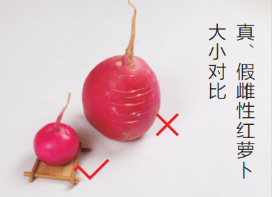 真的東北雌性紅蘿卜,每個(gè)重量只有2兩至5兩之間,而假冒的東北雌性紅蘿卜,一般都在半斤以上。目前網(wǎng)絡(luò)上出現(xiàn)大量的假冒雌性紅蘿卜均為農(nóng)貿(mào)市場(chǎng)上幾角錢(qián)一斤的普通菜蘿卜,并且根本無(wú)法保證沒(méi)有農(nóng)藥和化肥的殘留。