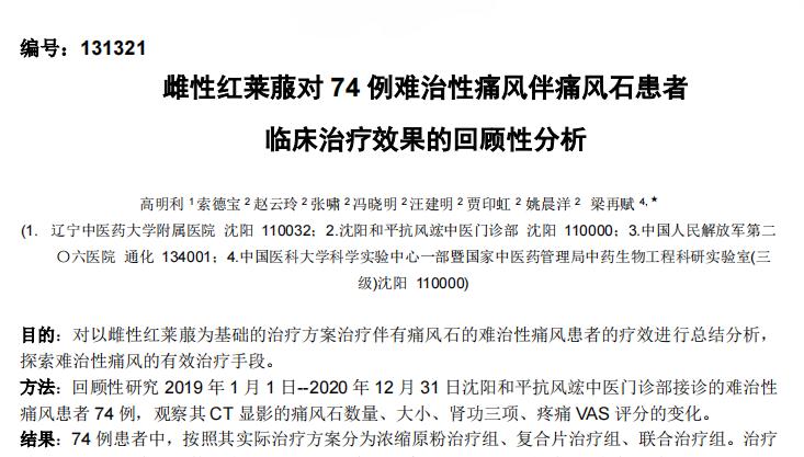其余投稿的兩篇論文分別為《雌性紅萊菔對(duì)74例難治性痛風(fēng)伴痛風(fēng)石患者臨床治療效果的回顧性分析》、《雌性紅萊菔凍干濃縮原粉對(duì)AGA模型大鼠抗炎、降尿酸及TLR-MyD88-1L-1β信號(hào)通路作用機(jī)制的研究》。